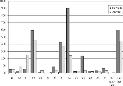 Abb. 29: Vergleich Gewicht und Menge der Warenarten. Warenart c3 umfaßt auch Topf III-114. Unter Hafnerware wurden nur die stratifizierten Komplexe angegeben. Vollständige Töpfe und große Scheben wurden je mit 1 gezählt. |